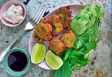 Zu den Fischfrikadellen passt sehr gut ein süß-sauer angemachter Gurkensalat mit kleinen